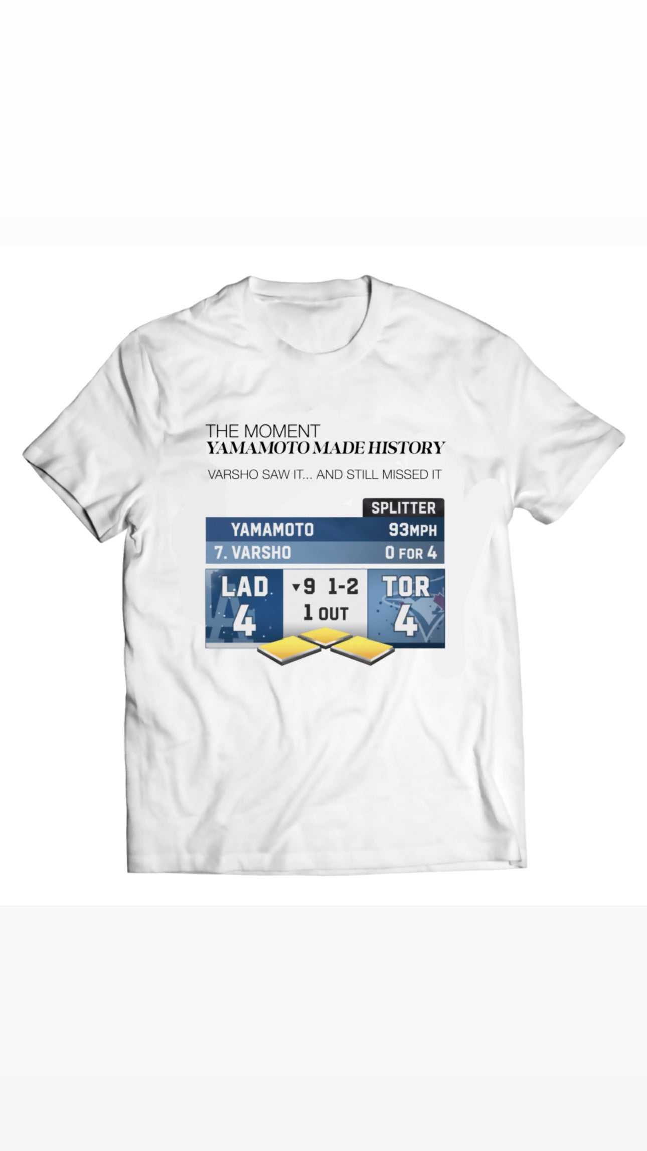 The design captures the official scoreboard look from that unforgettable World Series moment: Yamamoto vs Varsho, 1-2 count, 4–4 deadlock — and destiny just one pitch away. A clean, cinematic layout with crisp typography tells the story of dominance, precision, and Dodgers greatness.
